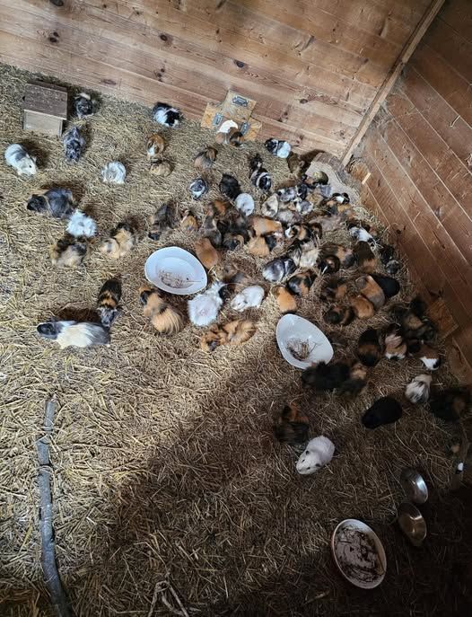 Zwei fühlbar tragende Weibchen sind dabei. Kein Schweinchen ist älter als max. 1,5-2 Jahre. Sehr viele Jungtiere (nicht Babys).